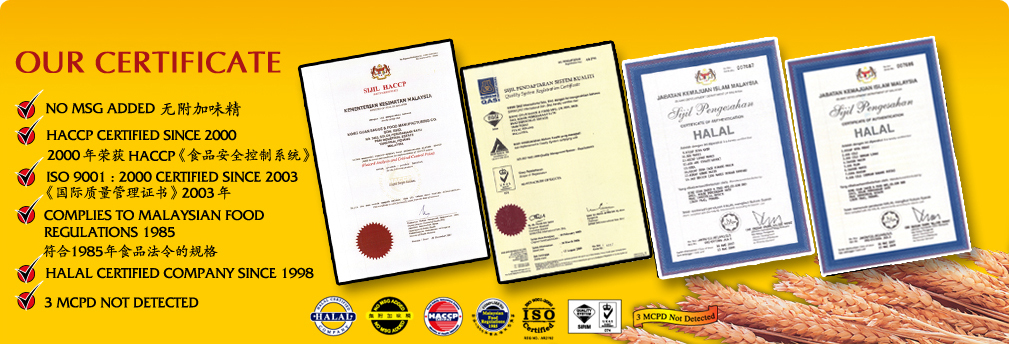 Kong Guan Sauce & Food Mfg. Co. Sdn. Bhd has developed and implemented a quality management system to better satisfy the needs of our valued customers and to improve the performance of the company. The quality management system complies with the International Standards ISO 9001:2008. Kong Guan Sauce & Food Mfg.Co.Sdn.Bhd wants to continue to be a reliable business partner deserving the trust of our valued customers placed in us. For this reason,we will stress on continual improvement in line with our customer requirements. |